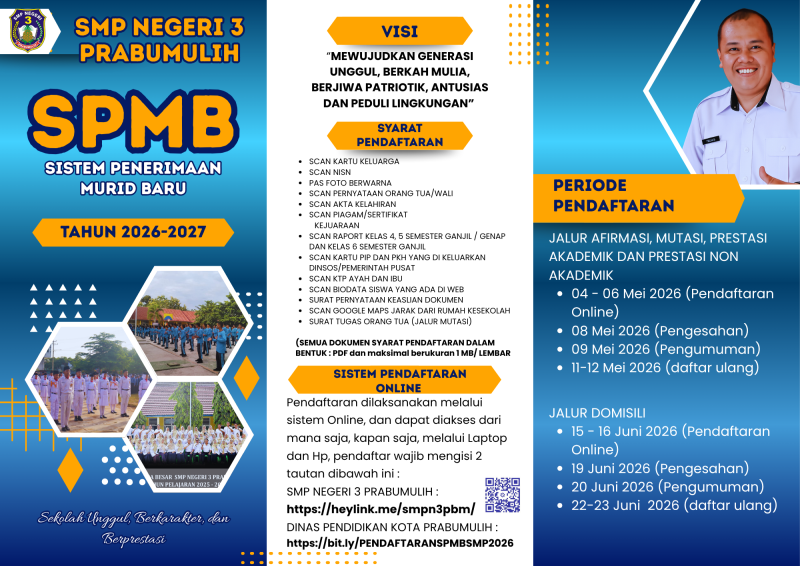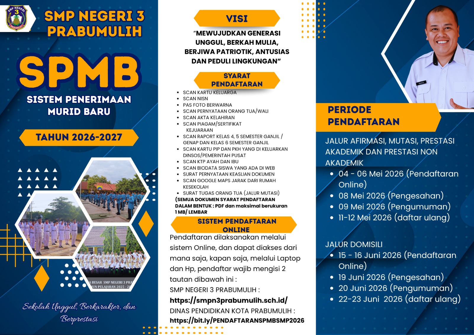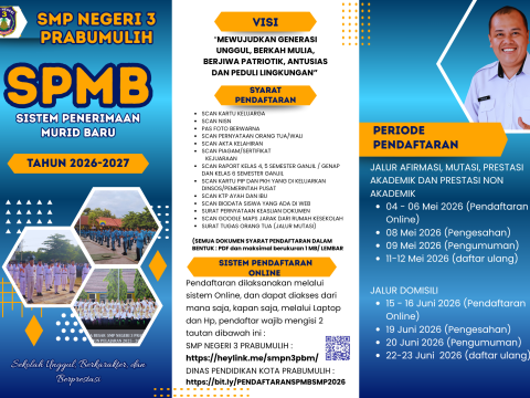 SMP Negeri 3 Prabumulih akan membuka pendaftaran peserta didik baru untuk Tahun Ajaran 2026/2027 pada tanggal 04 - 06 Mei 2026 Untuk Jalur Pendaftaran Prestasi, Afirmasi & Mutasi Orangtua dan tanggal 15 - 16 Juni 2026 untuk jalur Domisili .